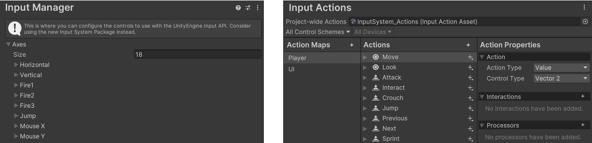 _On the left, the old Input Manager Axes Configuration window, in Project settings. On the right, the new Input System's [Actions Editor](xref:input-system-configuring-input)._