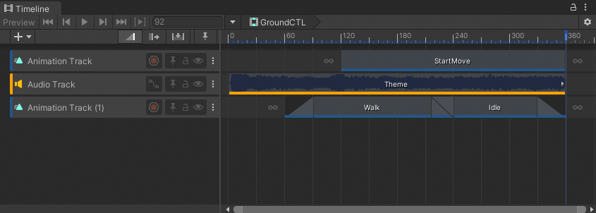 The Timeline window switches to the Sub-Timeline instance, indicated by the Timeline title which is the name and GameObject of the parent Timeline instance, followed by the name and GameObject of the Sub-Timeline instance.