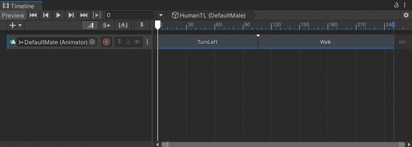 4. Play the Timeline instance. In this example, the DefaultMale animation jumps between each Animation clip because its position and rotation at the end of each clip does not match the position and rotation at the start of the next Animation clip.