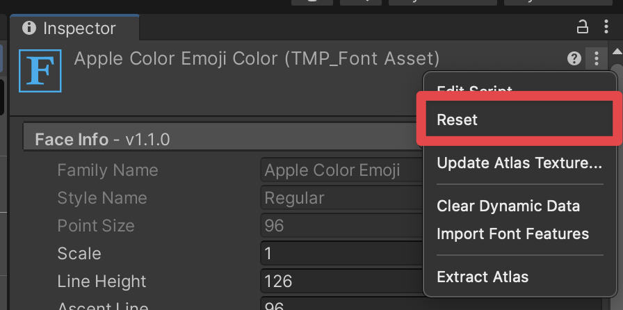 - Expand the top right menu in the FontAsset Inspector.