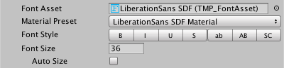 | Auto Size | Enable this option to set the font size automatically, based on the Auto Size Options. When this option is enabled, TextMesh Pro lays out the text multiple times to find a good fit. This is a resource intensive process, so avoid auto-sizing dynamic text that changes frequently. Tip: For static text, you can enable Auto Size, note the calculated font size (displayed in the Font Size field), then disable Auto Size and apply the calculated size manually. |