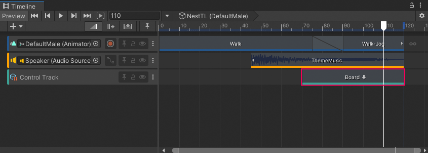 Drag a GameObject linked to a Timeline instance (BoardTL) into another Timeline instance (NestTL) to create a Sub-Timeline instance as a Control clip on a Control track